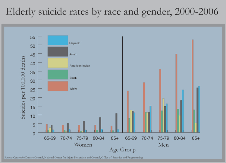 That attitude can be fatal. The suicide rate among the elderly is high: In 2007, it reached 14.3 per 100,000 people, compared to 11.5 among all Americans. Centers for Disease Control and Prevention statistics show that white men over 85 — the “old-old” — had the highest suicide risk.