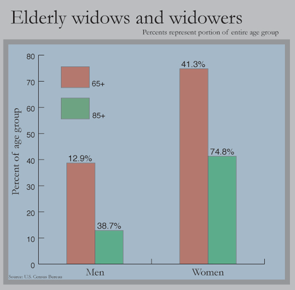Isolation can be particularly acute for seniors who lose their spouses and partners and live alone. Women far outnumber men in this group. They live longer, often were married to older men who died before them, and are less likely to remarry after a spouse’s death. Last year, 41 percent of American women over 65 were widowed, compared with 13 percent of men, census data show.