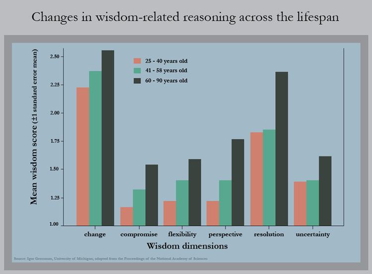 These qualities appear age-related. A recent University of Michigan study on aging and social reasoning tested people in three age groups, the oldest being 60 and over. Presented with a fictional geopolitical conflict, participants specified what they thought would happen and why. Igor Grossmann, a social psychologist and lead researcher on the study, and his team sorted the answers into six categories of “wisdom-related thinking,” including searching for compromise, admitting uncertainty and finding flexibility. The oldest group earned the highest wisdom score in each category.